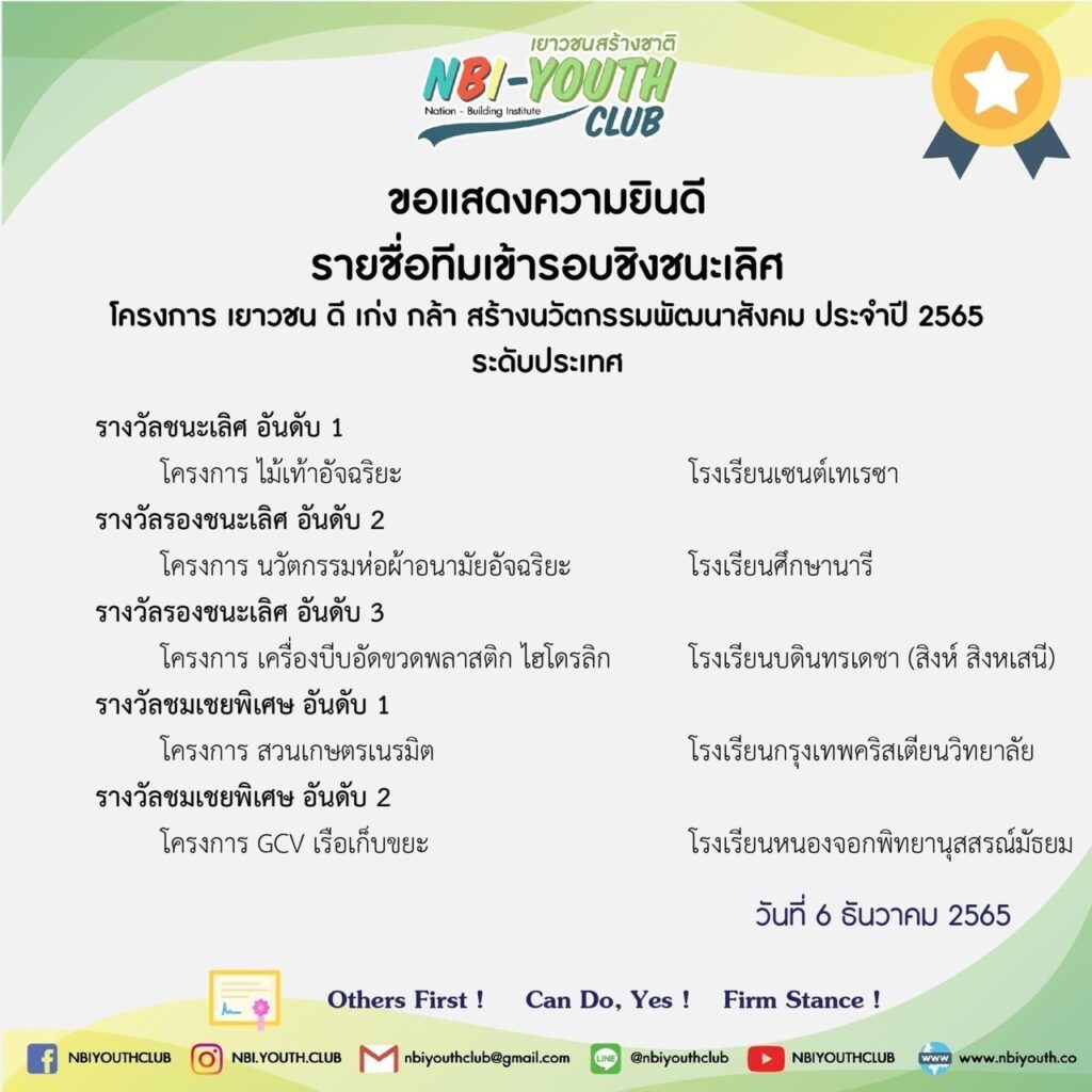 เอ็มม่า อลิส พาน้องๆโรงเรียนเซนต์เทเรซา คว้ารางวัลชนะเลิศอันดับ 1 ระดับประเทศอีกแล้ว ในรอบคัดเลือกนวัตกรรม โครงการ เยาวชน ดี เก่ง กล้า สร้างนวัตกรรมพัฒนาสังคม ประจำปี 2565 จัดโดย NBI-Youth CLUB ในสถาบันการสร้างชาติ (Nation – Building Institute : NBI) โดยในการแข่งขันครั้งนี้มีทีมร่วมแข่งขันมากกว่า 200 ทีมจากทั่วประเทศ โดยผลงานของนักเรียนที่คว้ารางวัลชนะเลิศมาคือ “ไม้เท้าอัจฉริยะเพื่อคนพิการและผู้สูงอายุ”